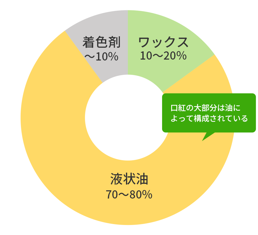メイクアップ化粧品の一種である口紅は、一般的に約2割が固形の油脂(ワックス)、約7割が液体の油脂(液状油)で構成されています。口紅をスティック状に保つワックスと、さまざまな感触の液状油を適切に組み合わせ、唇にムラなくなめらかに塗れるよう工夫されています。