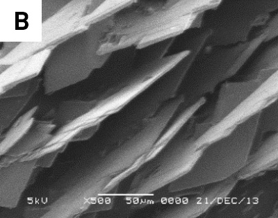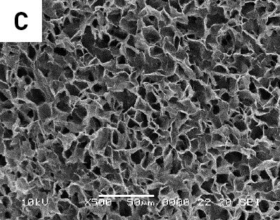 一方で、植物由来のワックスを使った耐久性の低い口紅では、図4. Aの写真のように図2で示したような石油由来のワックスのカードハウス構造が見られませんでした。この構造の違いにより、植物ワックスを使った口紅は硬さが出ず、折れやすくなります。 そこでワックスが形成する構造の違いに着目し、当社独自のエステル合成技術により、植物由来の新規エステルワックスを開発しました。この新規ワックスに特定の植物由来ワックスを組み合わせると、細かな板状のワックス結晶へと変化し、緻密なカードハウス構造を形成させることができました(図4. C)。新規ワックスと特定の植物由来ワックスを使用することで、カードハウス構造を形成し、口紅に必要な耐久性を持たせることができるようになりました。