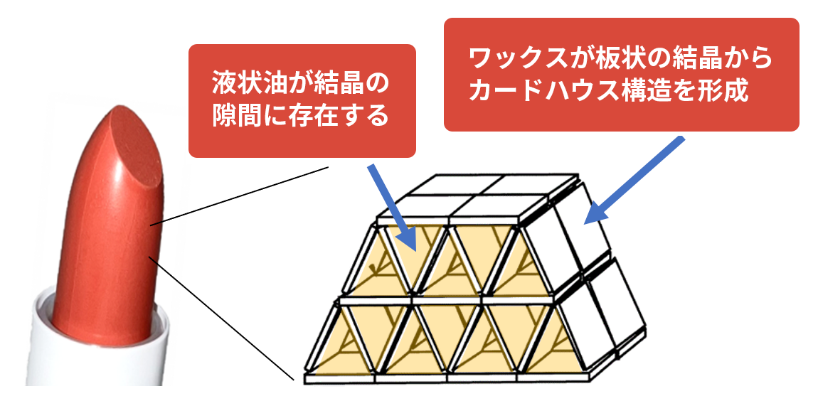 石油由来のワックスは強固なカードハウス構造を作ることで夏の暑さに強く形を保ちやすいという特性を生むため、口紅を折れにくく溶けにくくすることができ、実際の製品によく利用されています。
