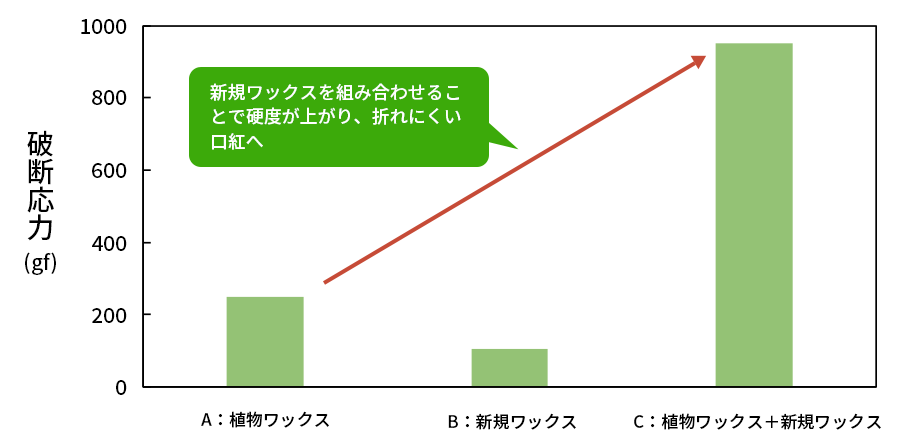 一般的な口紅には、主に石油由来のワックスが使用されますが、最近では環境保護への意識の高まりや、より自然由来成分を求める消費者ニーズの増加により、植物由来の天然ワックスが注目を集めています。しかし、植物由来の天然ワックスによる口紅にはいくつかの課題が存在します。例えば、硬さが不足していることや夏の暑さに弱く溶けやすいことといった特性があり、製品として十分な耐久性を持たせることが難しいといった課題が挙げられます。当社はお客さまのニーズに応えるため、口紅として耐久性を持たせることができる植物由来の新規ワックスの開発に取り組みました。