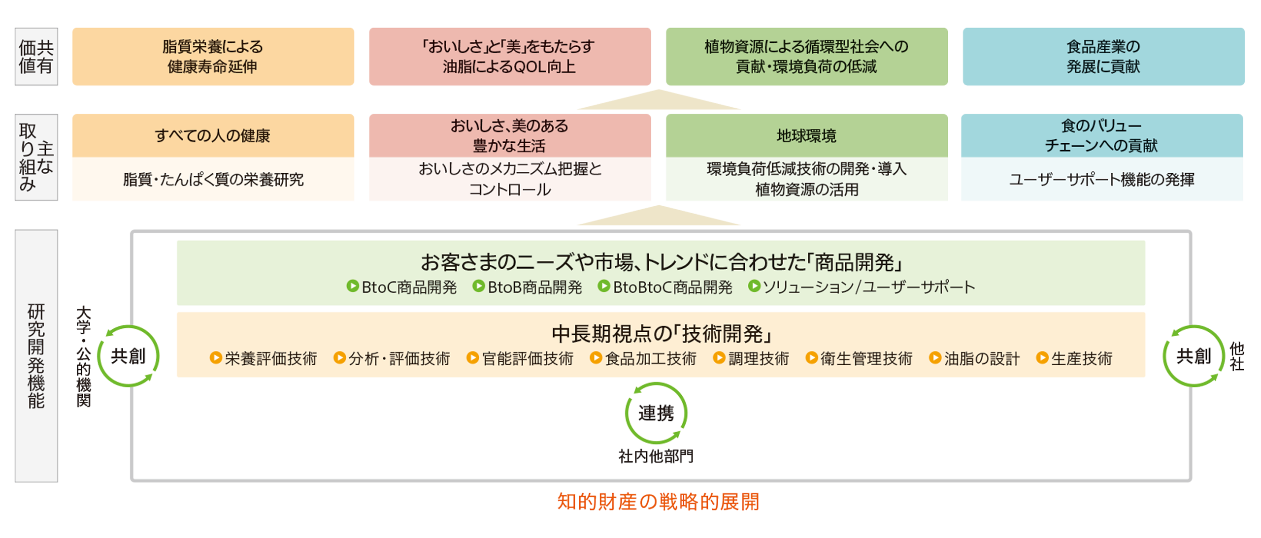 当社グループは、長年の植物油脂研究で培った知見をベースとした技術開発力と商品開発力により、「健康」「おいしさ」「利便性」「環境負荷低減」等、お客さまの多様なニーズや社会課題にお応えしています。油脂の栄養評価技術、おいしさ評価技術(分析・評価技術、官能評価技術)、油脂の製造および加工に関わる技術力などを強みとし、社内外での連携や共創を強化することで、「ビジョン2030」の各重点領域における共有価値の創造に向けた研究開発を行っています。