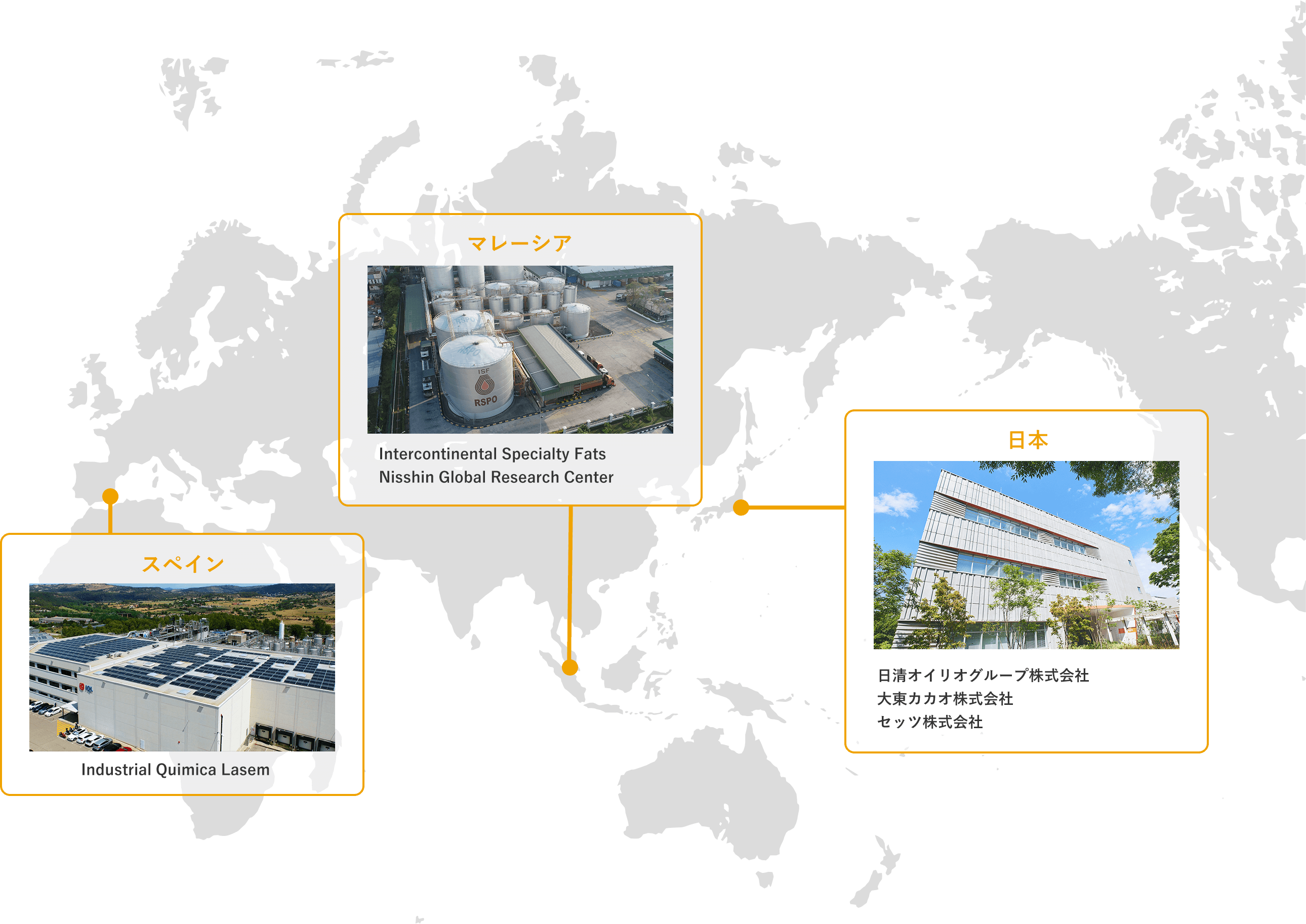 海外においては、マレーシアやスペインに拠点を置き、グローバルな研究開発体制を構築しています。パーム油の主要産地であるマレーシアには、Nisshin Global Research Centerを設置。グループ企業のIntercontinental Specialty Fatsも研究開発機能を有しています。スペインではファインケミカルの拠点であるIndustrial Quimica Lasemが研究開発を行っています。国内外の各拠点が連携し、価値創造に向けた取り組みを進めています。