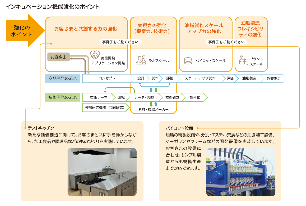 さらに、これら研究開発機能に加えて、商品化・事業化に至るまで一貫したプロセスを支援するインキュベーション機能を担っており、共創型のキッチンやサンプル製造から小規模生産まで対応可能なパイロット設備を設け、お客さまと共に、一緒に手を動かしながら開発を行うことで、新たな課題解決・価値創造につなげています。