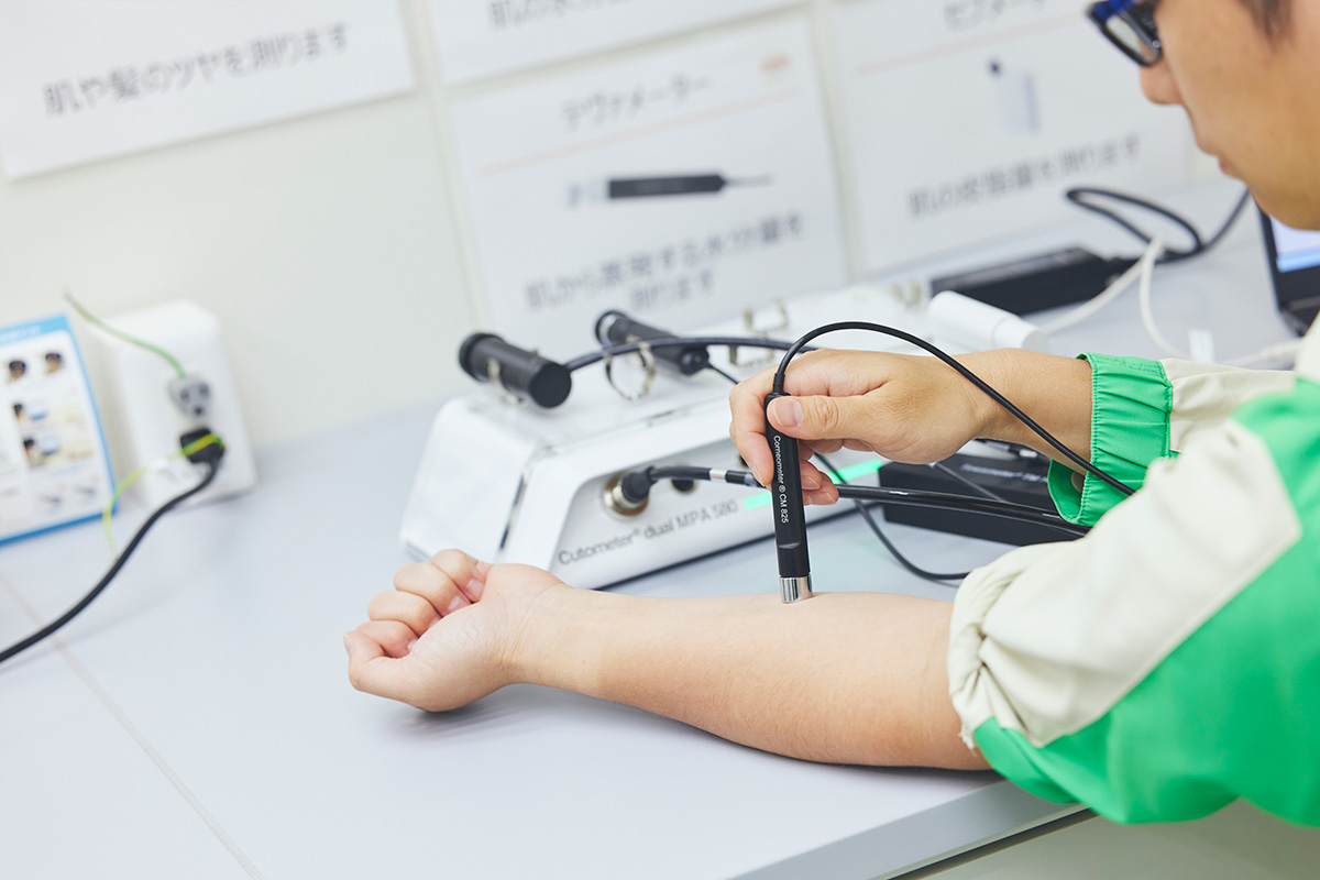 また、ファインケミカルの化粧品原料の研究開発環境も充実しました。化粧品を調製するのに欠かせないのが“エステル油”です。化粧品には、保湿や感触、発色、ツヤのよさなどさまざまな機能が求められ、それらを実現するために“エステル油”などの油剤を用います。お客さまが求めるさまざまな物性・機能を持つ新しい“エステル油”を開発したり、当社の化粧品原料の機能を活用したソリューションビジネスを展開していきます。新設した恒温恒湿室では、温度・湿度をコントロールし、さまざまな測定機器を用いて肌の状態を正しく客観的に観察・評価することができます。このような環境で、お客さまと共に直接コミュニケーションをとりながら、ニーズにお応えする高品質・高機能な商品をお届けしていきます。