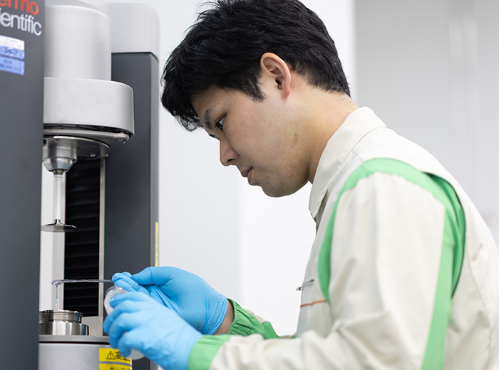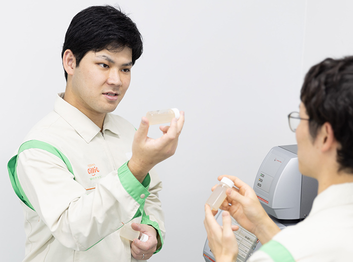当社といえば食用油のイメージを持つ方が多いかと思いますが、化粧品原料などを扱うファインケミカル事業も展開しています。私のキャリアはファインケミカル事業の製品開発部門でスタートし、3年間、化粧品原料や化学品に使用されるエステル油の開発を担当していました。この業務を通じて、さまざまな製品の製造方法や分析評価技術を習得し、技術者としての基盤を築くことができました。現在は応用研究所で、環境負荷の少ない製法の開発や植物由来原料を用いた食品・ファインケミカル製品の開発に取り組んでいます。具体的には、日用品価格やエネルギーコストの高騰といった社会課題の解決に向けて、価格と付加価値を両立した製品の開発や、環境負荷が少ない効率的な製法の確立を目指しています。これまでに培ったスキルを活かし、お客さまと地球にやさしい製品開発を実現するため、日々挑戦を続けています。