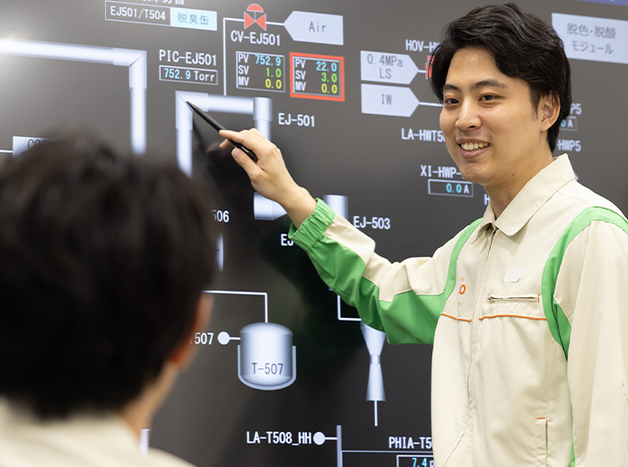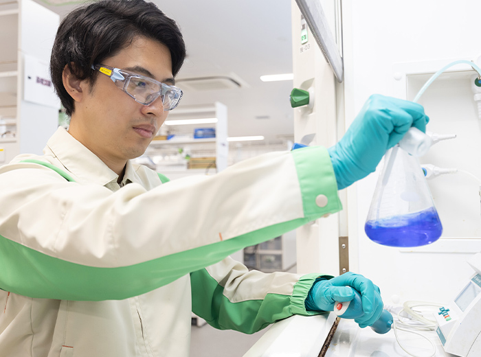現在の部署では、ラボスケールにおいて生み出された新たな価値を、お客さまへ提供するために、サンプルや製品の小規模生産、パイロットスケールで新たなシステムを用いた技術開発を行っています。製造業務は一人で行うことができないため、チームワークを重視しています。資材の発注などの事前準備から製造の実作業、製品出荷まで、メンバーで役割を分担し、効率的に製造をしています。一方で、ミスを防ぐために、お互いにコミュニケーションを意識しながら作業を進めることも重要です。さらに、国内だけでなく海外の拠点とも連携しており、部署の垣根を越えたコミュニケーションも欠かせません。担当者と密に連携し、着実に作業を進めることで新たな技術導入に近づく過程にやりがいを感じています。