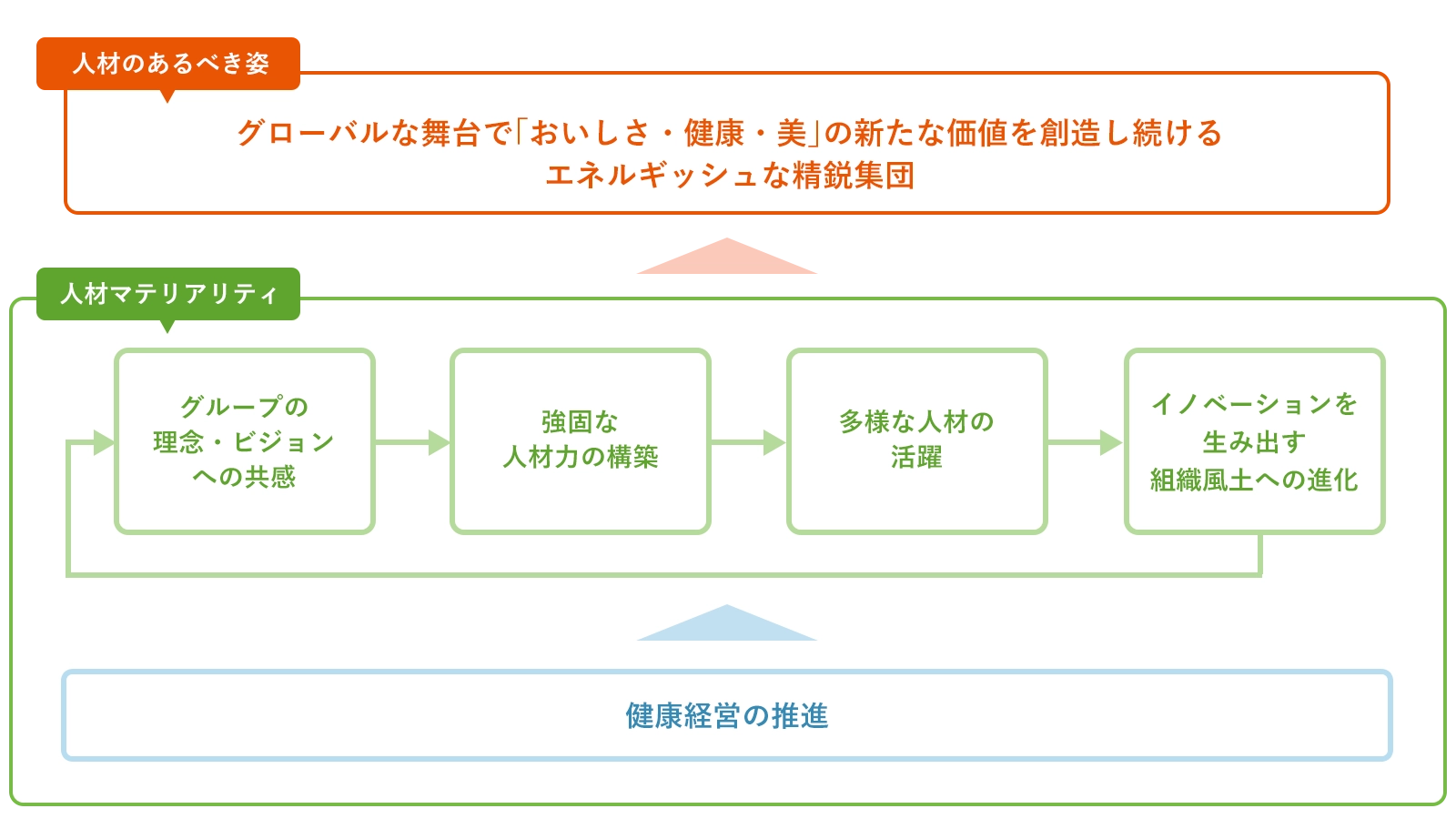 当社グループは、グループのビジョンや事業戦略と連動した人材のあるべき姿を「グローバルな舞台で『おいしさ・健康・美』の新たな価値を創造し続けるエネルギッシュな精鋭集団」と定義しています。そして、人材のあるべき姿に到達するために必要な当社グループの人材領域における重要課題(人材マテリアリティ)として「グループの理念・ビジョンへの共感」「強固な人材力の構築」「多様な人材の活躍」「イノベーションを生み出す組織風土への進化」「健康経営の推進」を掲げ、各人材マテリアリティに対し、積極的な投資やグループ一体となった取り組みを推進しています。