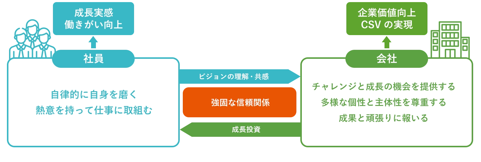 - ・会社と社員の強固な信頼関係のもと、多様な個性(能力・経験・感性・価値観等)を最大限発揮することでエネルギッシュな組織風土を醸成し、共に成長し続ける。