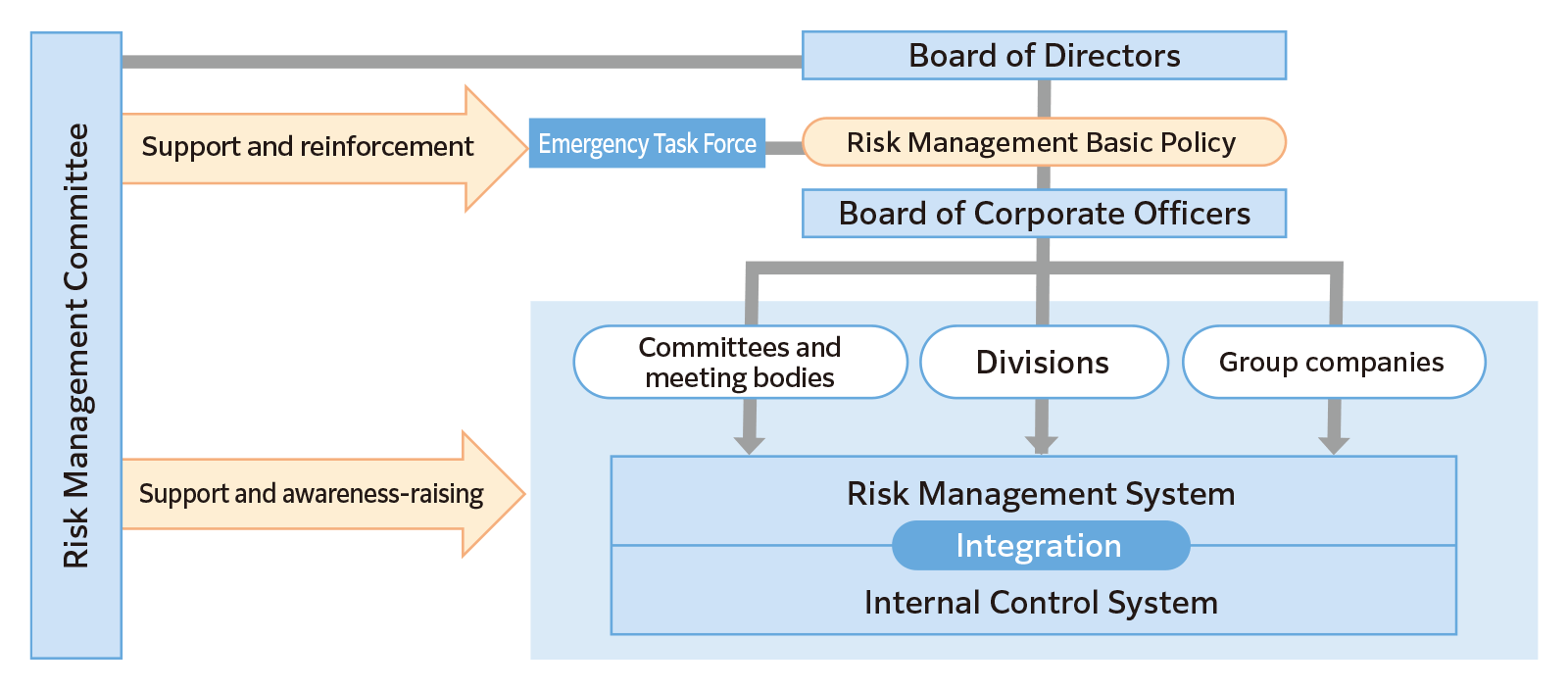 The Risk Management Committee assumes a supervisory role as an advisory body to the Board of Directors, which involves mounting a crisis response upon establishing an emergency framework in the event that a risk materializes. In addition, the Risk Management Committee identifies divisions in charge of material risks, which involves preparing risk maps upon having taken an inventory of risks. The committee also engages in Company-wide initiatives to prevent and minimize risk by having respective divisions implement risk management practices enlisting the plan-do-check-act (PDCA) cycle approach.