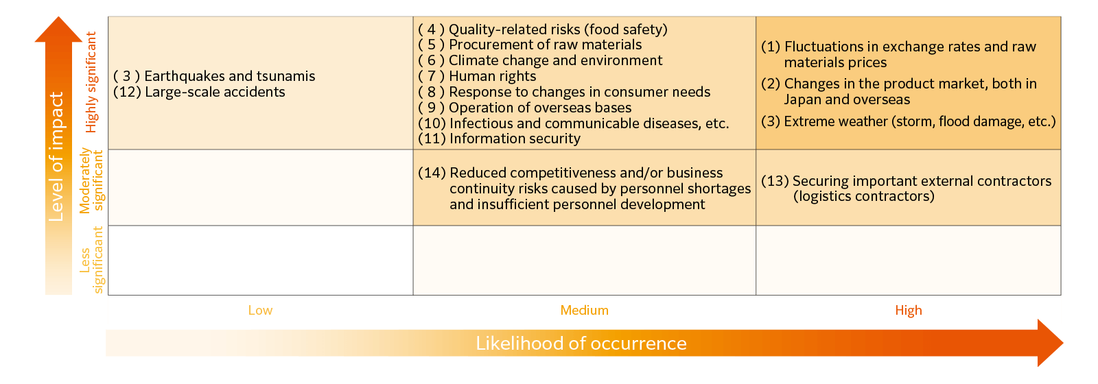 | Strengthening the BCP—even if natural disasters become more frequent and severe due to climate change—could allow the Company to maintain its system for supplying products during emergencies, helping stabilize and increase sales, improving its social value, increasing its stock price, and facilitating fundraising. | Medium | High | ||||||