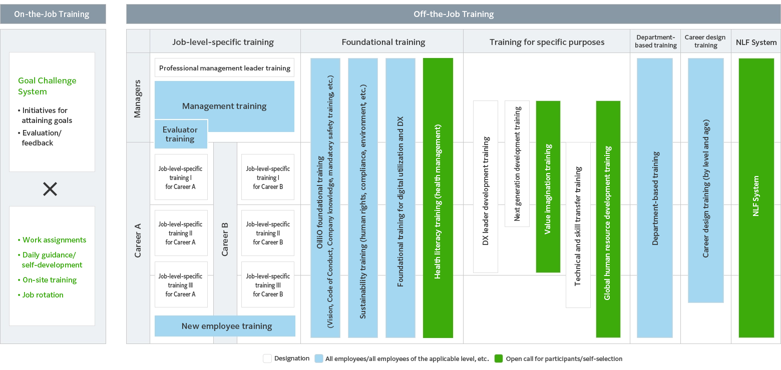 Our systematic human resource development, which includes not only on-the-job training but also job-level-specific training, foundational training, and training for specific purposes, helps boost capabilities and literacy as well as enhances knowledge among all of our employees.