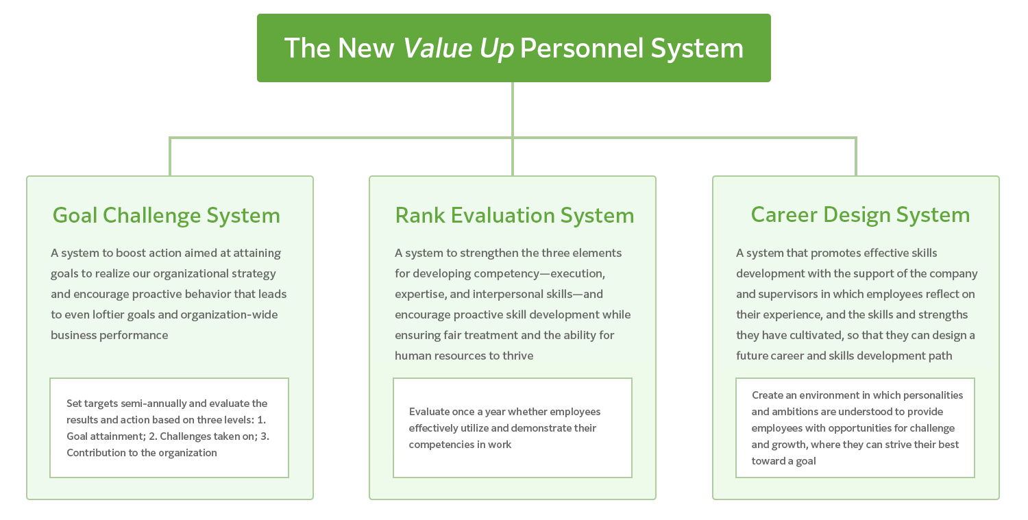 As a mechanism to achieve sustainable growth for both individual employees and corporate value, we have built three core systems within the New Value Up Personnel System.