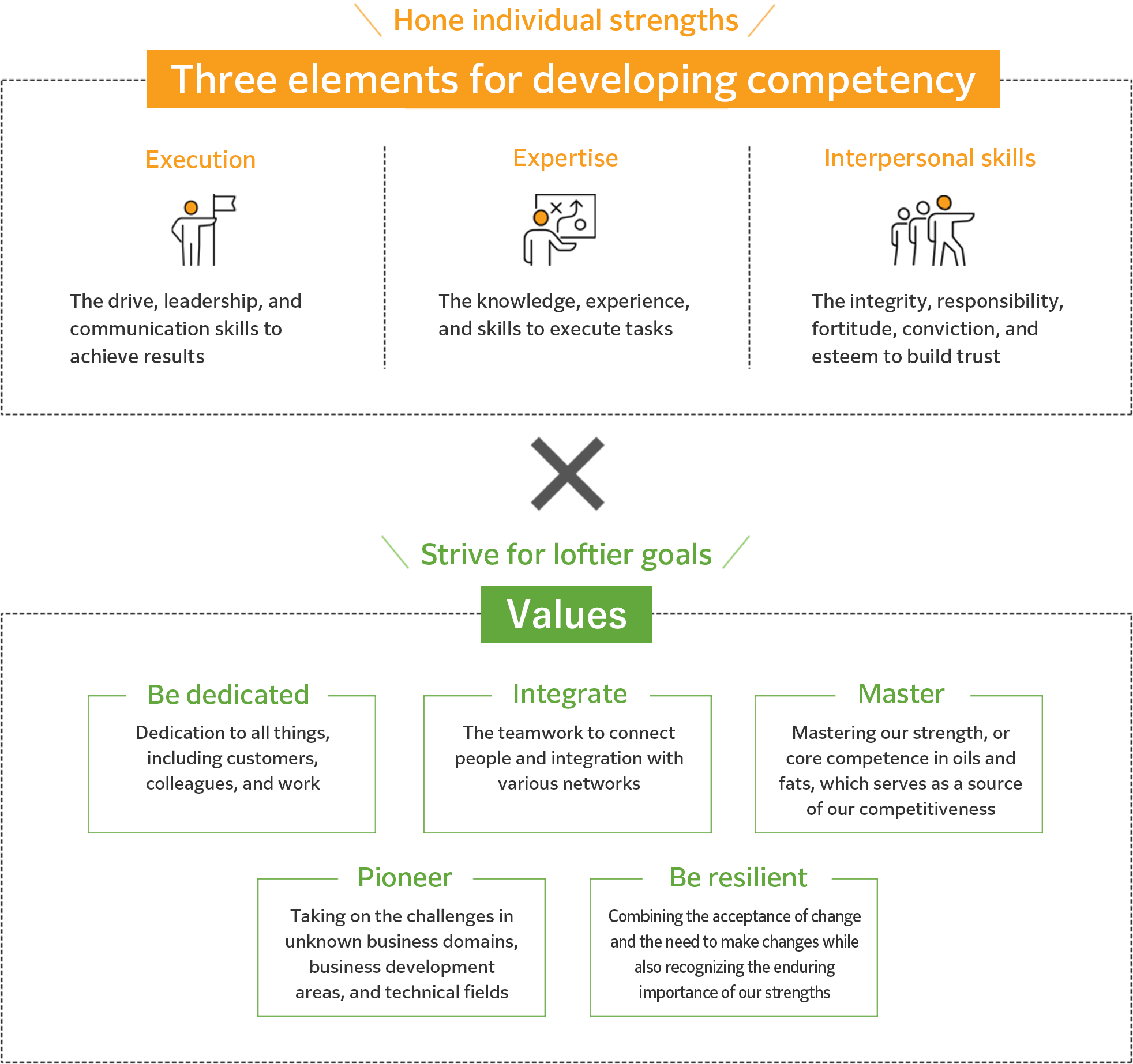 Employees are expected to continuously hone the three competencies of execution, expertise, and interpersonal skills as well as to embody the values that serve as the foundation for conduct within the Group. They must strive for even loftier goals in their actions—a concept also reflected within the personnel management system.
