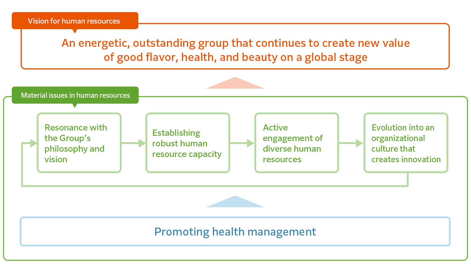 The Group defines its ideal human resources in line with the Group vision and business strategy as an energetic, outstanding group that continues to create new value of good flavor, health, and beauty on a global stage. We have identified material issues in human resources required to achieve our Vision. They are: “Resonance with the Group’s philosophy and vision,” “Establishing robust human resource capacity,” “Active engagement of diverse human resources,” “Evolution into an organizational culture that creates innovation,” and “Promoting health management.” We are proactively investing in and conducting Group-wide initiatives for each of these material issues.