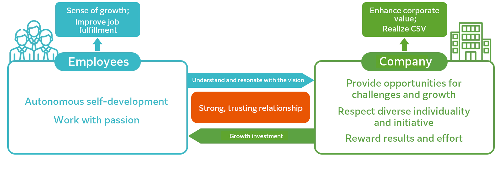 The basic principle of our personnel system is to enhance the value of employees and organizations with diverse strengths. We define employee engagement as “resonating with our Vision and having proactive motivation to contribute to work and the organization.” To boost employee engagement, we provide an environment where employees can take on challenges in creating value and grow continuously through their work. The Company and employees will continue to grow together by building relationships of mutual trust that contribute to one another.