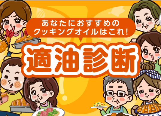 クッキングオイルは商品ごとに風味や健康性、機能性など特長が異なります。あなたに合った商品選びをサポートするのが「適油診断」です。