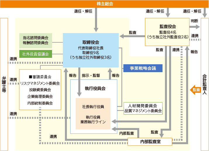 コンプライアンス、リスクマネジメント体制については、取締役会の審議委員会であるリスクマネジメント委員会、企業倫理委員会などを設置し、必要に応じ顧問弁護士などとの連携を図り、専門的な見地から意見を答申しています。