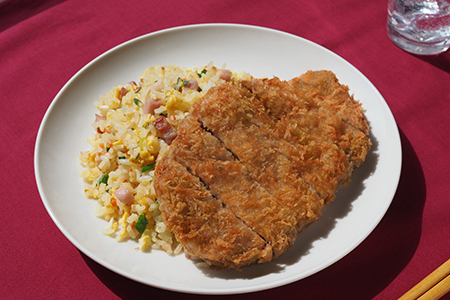 - ❽食べやすいサイズに切り、チャーハンの上にトッピングしてできあがり。お好みでとんかつソースを添える。