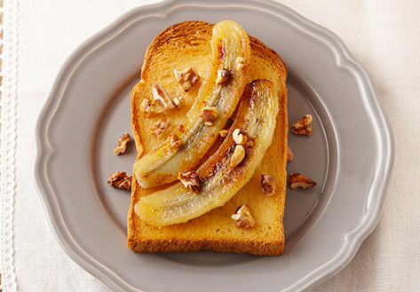 - ❶バナナは縦半分に切り、日清有機エキストラバージンココナッツオイルを入れたフライパンで、切った断面を焼く。
