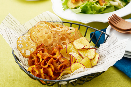 - ❷鍋に日清ヘルシークリアを3cm深さに入れ、130℃に熱して①を1種類ずつ入れて時々混ぜてゆっくり揚げる。カラッとしてきたら温度を170℃まで上げて、野菜が色づいたらしっかり油をきる。(急に色づくので焦がさないように注意。)素揚げ野菜を合わせて塩少々(分量外)をふる。