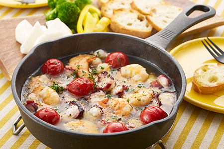 エビやタコのうまみがギュッとつまったアヒージョ。日清やさし~く香るエキストラバージンオリーブオイルで作れば、素材の味がより活きます。