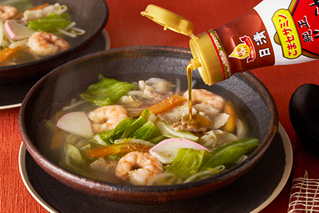 - ❷フライパンに日清ヘルシーごま香油を熱し、豚バラ肉としょうがを炒める。豚バラ肉の色が変わったら玉ねぎ、キャベツ、にんじん、むきエビを入れて炒める。Aを加えて3分ほど中火で煮て、もやしとかまぼこを加えて1分煮る。器に盛り、日清かけて香る純正ごま油を回しかけ、こしょうをふっていただく。