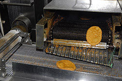 その後丸型に成型。そしてパン粉付けの工程へ進みます。パン粉付けは一般的なコロッケのように小麦粉をはたいて玉子をくぐらせるのではなく、すり身に直接付けます。これが他のフライと違うところ。パン粉の付いたすり身はフライヤーに投入され200度の油で揚げられます。フライヤーをくぐって、揚げたて、アツアツのフィッシュカツが姿を現しました。1枚ずつ並べて油切りをしながら常温で1時間ほど冷まし、さらに10度以下まで二次冷却。そしてパック詰めし、シールを貼ると消費者の食卓目指して出荷されていきます。