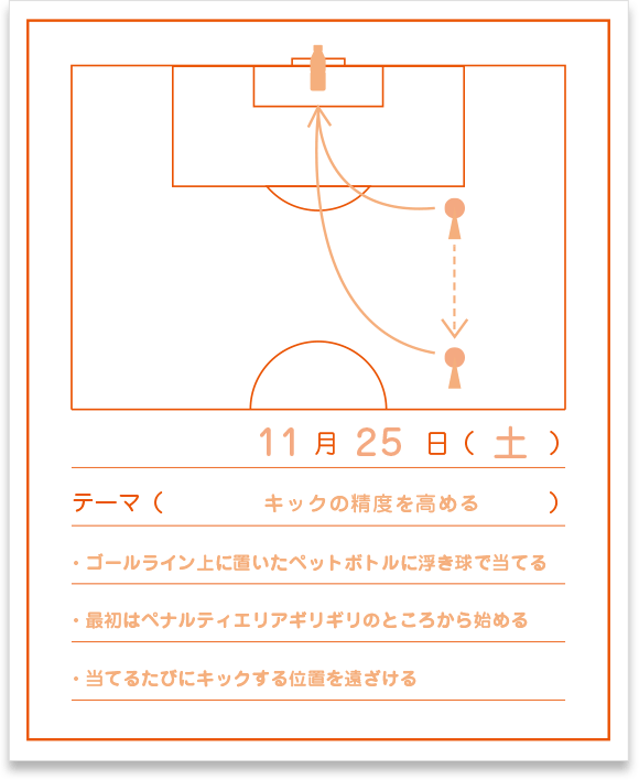 3つ目は、自分で考えた練習メニューをノートに書くことです。「これとこれを組み合わせたら面白い練習になるかな?」というアイディアを書くことで、サッカーが上手くなる上で何よりも必要な「自分で考える力」が身についてきます。