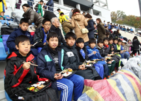 11月23日の決勝戦に先立ち、19日に行われたラウンド32では、協賛社である日清オイリオによる食事・栄養のサポート活動が行われました。会場となった町田市市営陸上競技場では、トップアスリートの食事・栄養をサポートする日清オイリオの公認スポーツ栄養士が監修し、サッカーをがんばる選手たちに最適な栄養バランスで構成された「エナジーサポーター弁当」が、出場チームに提供されました。