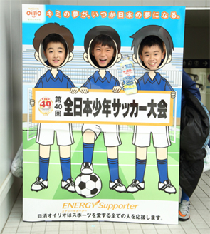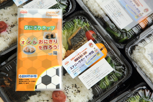 また、この他にも会場入り口での記念撮影パネルの設置や、オリジナルおにぎりラップの配布も行われました。選手の保護者からは「サッカーボール型のラップは初めて見ました。家でも使ってみたいです」など、好評を博していました。日清オイリオは、今後も食事・栄養サポートを通して、頑張る子供たちを応援していきます。